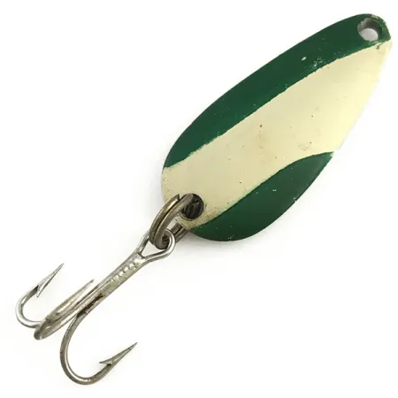 Zelený a bílý nátěr nanesený ve výrazném diagonálním pruhovaném vzoru definuje přední stranu této vintage kovové plandavky. Na leštěné niklové zadní straně je vyražena klasická značka „NEBCO TOR-P-DO-1 MPLS, MINN“, která označuje její původ v Minneapolis v USA. Tento exemplář váží 1/4 unce (7 g), měří 1 1/2" (4 cm) na délku a nese kód produktu 5784. Konstrukce se vyznačuje klasickým kapkovitým profilem vhodným pro různé techniky nahazování a trollingu. Osazení zůstává pevné, skládá se z originálního kroužku a ostrého trojháčku. Stav je hodnocen 5/5, přičemž lakování zůstává ostré a niklová strana vykazuje jasný, reflexní povrch.