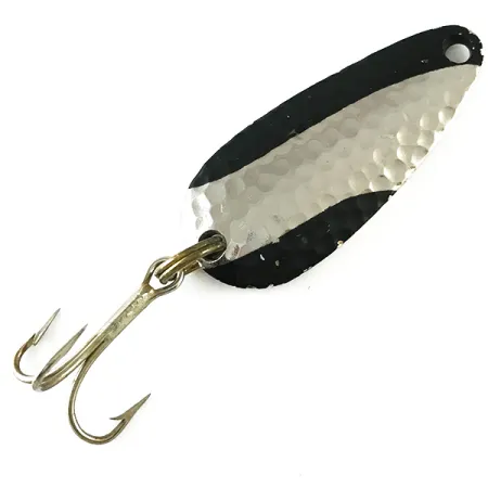 Textura tloukaného niklu v kombinaci s výraznými černými akcenty definuje nápadný vizuální profil této vintážní plandavky. S délkou 1 1/2" (4 cm) a hmotností 1/4 oz (7 g) nese tento exemplář na leštěné zadní straně zřetelnou ražbu „NEBCO“ TOR-P-DO-1 spolu s místem původu Ripley, Miss. Přední strana má tloukaný povrch navržený tak, aby zachycoval a odrážel světlo, orámovaný sytě černou barvou na koncích. Plandavka s kódem produktu 6235 je osazena klasickým trojháčkem zajištěným pevným kroužkem. Zpracování z masivního kovu je typické pro americkou výrobu poloviny století z USA. Stav je vynikající, s dobře zachovalým povrchem a ostrou ražbou, což odpovídá hodnocení 5/5. Očko pro navázání vlasce je čisté a přesně vyvrtané v užším konci kapkovitého těla.