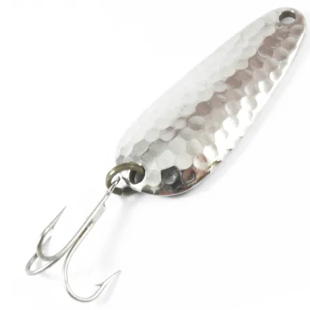 Na hladké niklové zadní straně této 5 cm (2") plandavky je jasně vyražen její původ: „NEBCO TOR-P-DO 2 MPLS. MINN.“, což je přímý odkaz na výrobní historii značky v Minneapolis. Tato 14g (1/2 oz) nástraha má na konvexní straně výraznou povrchovou úpravu z tepaného niklu, která je navržena tak, aby při navíjení zachycovala a odrážela světlo z mnoha úhlů. Osazení tohoto exempláře, katalogizovaného pod kódem produktu 3585, zahrnuje robustní trojháček připevněný pomocí pevného kroužku, přičemž obojí je ve vynikajícím stavu. Vzhledem k hodnocení stavu 5/5 zůstávají kovové povrchy lesklé a bez výrazného opotřebení nebo stop. Tvar kapky a rozložení hmotnosti z ní dělají všestranný nástroj pro přívlač i vertikální jigging, ztělesňující americký design rybářského náčiní poloviny století. Přesně vyříznuté očko na úzkém konci doplňuje jednoduchou a účinnou geometrii této nástrahy vyrobené v USA.