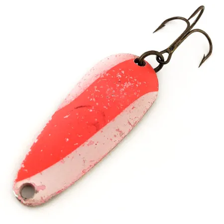 Povrchová úprava této plandavky pod ultrafialovým světlem září výrazným oranžovým a modrým kontrastem, což odhaluje její speciální fluorescenční vlastnosti. Nebco Tor-P-Do 2 UV, označená kódem produktu 13144, měří 5 cm (2") na délku a váží 14 g (1/2 oz). Zatímco v přirozeném světle vykazuje klasický červeno-bílý pruhovaný vzor, UV reaktivní povlak je navržen pro viditelnost v hlubokých nebo zakalených vodách. Tento exemplář vyrobený v USA je v kondici 5/5, přičemž si zachovává hladký povrch a zářivou pigmentaci na celém kovovém těle. Výbava zahrnuje robustní kroužek a ostrý trojháček s bronzovou povrchovou úpravou. Rybáři tento kapkovitý tvar obvykle používají pro nahazování a trolling. Přední očko zůstává čisté bez nánosů barvy, což umožňuje bezpečné připojení ke karabince nebo návazci.