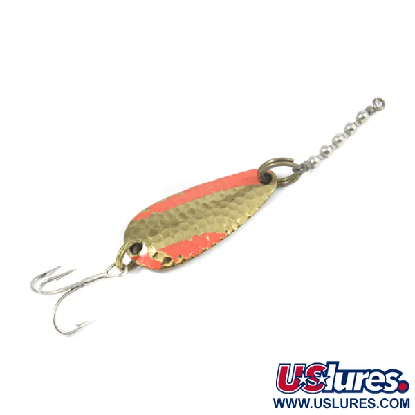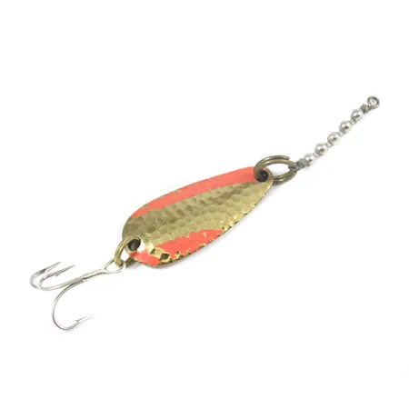 Diagonální červené pruhy protínají tepaný zlatý povrch této 4 cm (1 1/2") třpytky a vytvářejí výrazný vizuální kontrast. Tento exemplář o hmotnosti 7 g (1/4 oz) se vyznačuje hluboce tepanou texturou na přední straně pro maximalizaci odrazu světla. Otočení nástrahy odhalí hladkou, leštěnou zlatou zadní stranu s jasně vyraženými značkami výrobce: „Nebco“, „TOR-P-DO-1“ a „MADE IN USA“. Osazení zůstává neporušené a skládá se z kroužku spojeného s řetízkovým obratlíkem, který je navržen tak, aby zabránil kroucení vlasce při nahazování nebo trollingu. Nástraha s hodnocením 4/5 vykazuje mírné známky používání při zachování strukturální integrity a zářivého povrchu. Ostrý trojháček je k zadní části připevněn pomocí kroužku, což doplňuje tento klasický americký kousek evidovaný pod kódem produktu 2082.