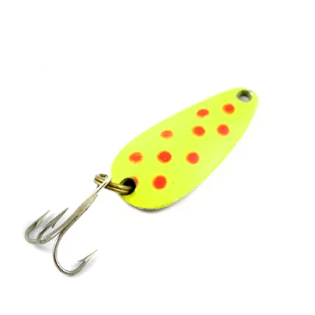 Tato kompaktní plandavka o hmotnosti 9 g (1/3 oz) má zářivě žlutou přední stranu s výraznými oranžovo-červenými tečkami. Zadní strana odhaluje leštěný niklový povrch s hluboce vyraženými nápisy „NEBCO“ a „TOR-P-DO“, což dokládá její americký původ. Kovové tělo o délce 4 cm (1 1/2") je osazeno robustním mosazným kroužkem a stříbrným trojháčkem. Lakování na přední straně je pozoruhodně čisté, zatímco niklová zadní strana si zachovává vysoký lesk, což odpovídá hodnocení stavu 4/5 pro tento model 2751. Rybáři obvykle používají tento kapkovitý profil pro různé techniky nahazování nebo trollingu. Ražené písmo na konkávní straně zůstává ostré a čitelné, což je klíčový detail pro sběratele historického vybavení Nebco.