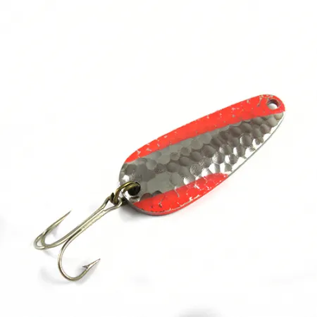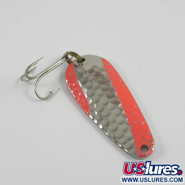 Na hladké zadní straně kovu je jasně vyraženo „NEBCO TOR-P-DO MPLS. MINN“, což značí jeho původ v srdci rybářského průmyslu v Minnesotě poloviny minulého století. Přední stranu pokrývá klasická povrchová úprava z tepaného niklu, lemovaná zářivě oranžovým barevným vzorem, který skvěle odráží světlo. Kovové tělo o hmotnosti 1/2 oz (14 g) a délce 2" (5 cm) si zachovává svůj původní lesk, čímž si za své zachovalé povrchy vysloužilo hodnocení stavu 5/5. Pod produktovým kódem 2784 je tato plandavka vybavena robustním trojháčkem zajištěným pojistným kroužkem na ocase. Kapkovitý tvar je základem pro rybáře cílící na různé sladkovodní druhy pomocí přívlače nebo trollingu.