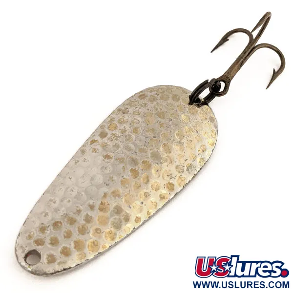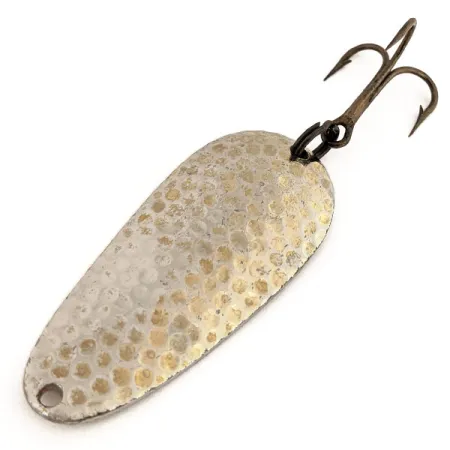 Povrch z tepané mosazi vytváří na této 25g (1oz) plandavce výrazný reflexní povrch. Na zadní straně je jasně vyražena značka Tor-P-Do 3, identifikující její původ z Minneapolis v Minnesotě pod značkou Nebco. Kovové tělo o délce 6,5 cm (2 1/2") si zachovává čistý povrch s hodnocením stavu 5/5. Tento konkrétní kus s kódem 12762 se vyznačuje kapkovitým profilem navrženým pro stabilitu při hlubinném trollingu nebo dalekém nahazování. Výbava zůstává robustní, tvořená silným trojháčkem připevněným přes pevnostní kroužek. Vyražené očko na užším konci poskytuje bezpečný bod pro připevnění lanka nebo obratlíku.