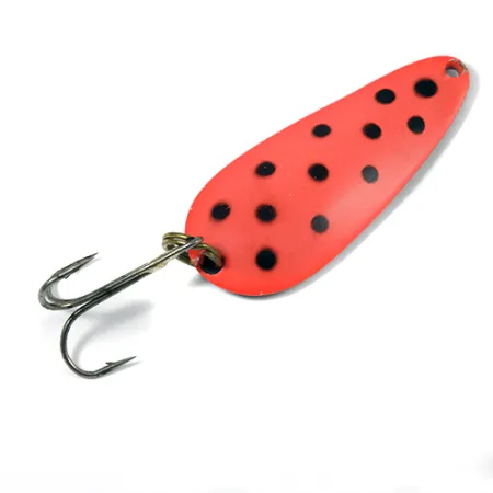 Na poniklované zadní straně je jasně vyraženo označení „NEBCO TOR-P-DO 4“, které tuto nástrahu identifikuje jako klasickou americkou plandavku z Holdingfordu v Minnesotě. S hmotností 45 g (1 2/3 oz) je nástraha určena pro lov ve velkých hloubkách nebo pro daleké náhozy proti větru. Přední strana má zářivě červenou povrchovou úpravu s výraznými černými tečkami, což je vysoce viditelná varianta do kalné vody. Plandavka měří 7,5 cm a její robustní provedení odráží funkční design starších nářadí Nebco. Tento konkrétní kus (kód 2083) je ve stavu 4/5 a vykazuje jen mírné známky stáří. Osazení je funkční, s pevným trojháčkem zajištěným silným kroužkem u paty těla kapkovitého tvaru.