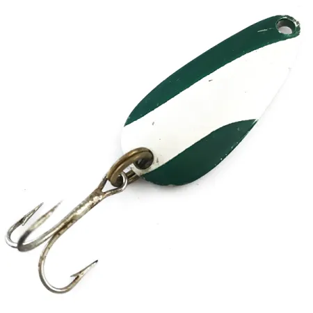 Diagonální zelené a bílé pruhy definují horní stranu této 4 cm (1 1/2") plandavky vyrobené v Minneapolis. Na poniklované zadní straně je vyražena značka "NEBCO" TOR-P-DO-I, která zdůrazňuje její původ z MPLS, MINN, USA. Kovové tělo o hmotnosti 9 g (1/3 oz) je v katalogu vedeno pod kódem 5292. Lakovaný povrch vykazuje upřímné známky používání odpovídající hodnocení stavu 4/5, zatímco podkladový nikl zůstává jasný. Původní osazení zůstalo neporušené, včetně kroužku a robustního trojháčku na konci. Tyto detaily odrážejí utilitární design běžný u amerického náčiní z poloviny století.