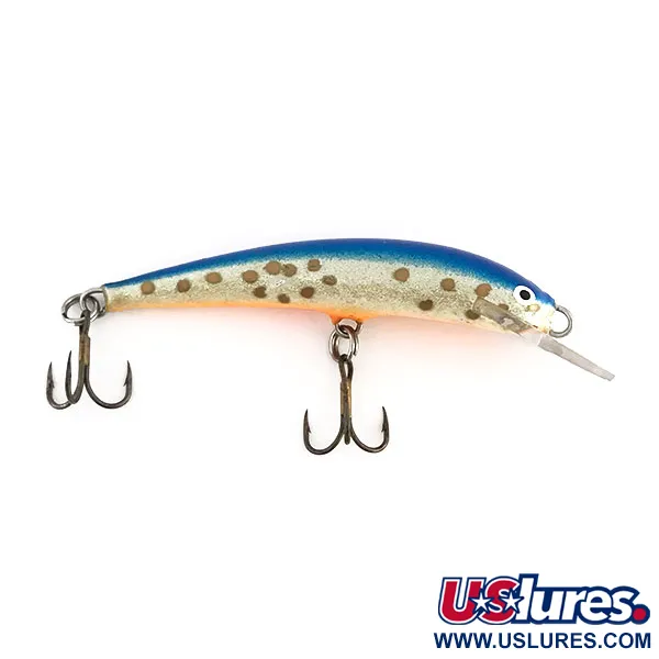 Tento ručně vyráběný dřevěný wobler z Finska představuje legendární sérii Nils Master Invincible Floating s produktovým kódem 9226. Barevné provedení Light Blue Trout se vyznačuje zářivě modrým hřbetem přecházejícím do třpytivého stříbrno-zlatého boku s výraznými hnědými tečkami a jemně oranžovým břichem. Při váze 8 g (1/4 oz) a délce 8 cm (3 1/4") je jeho design charakteristický širokými boky a shora mírně zploštělým profilem. Řemeslníci z Finlandia Uistin vyrobili tuto tichou nástrahu pro přívlač i trolling, přičemž dosahuje hloubky 2 m (6,5 ft). Osazení tvoří dva ostré trojháčky zajištěné pevnými kroužky. Tento konkrétní kus zůstává ve vynikajícím stavu s hodnocením 5/5, což dokládá pečlivé zpracování finských mistrů. Čiré nořítko je pevně zasazeno pro lov dravců, jako jsou pstruzi, lososi a štiky.