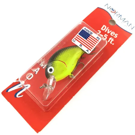 Tento mělce potápivý crankbait s pracovním ponorem 0,6 až 1,5 m (2-5 stop) se vyznačuje klasickým, vysoce viditelným barevným provedením Chart / Černá / Oranžová, označeným kódem barvy MAD-21. Tento exemplář s produktovým kódem 11352 váží 11 g (2/5 oz) a měří přesně 5 cm (2"). S hodnocením 6 je nepoužitý a dochovaný v původním červenobílém vintage balení. Čirá lopatka je integrována do kompaktního těla navrženého pro nahazování i trolling. Na zadní straně karty je stále vidět podrobný návod „Tuning a Crankbait“ a tabulka hmotnosti a délky typická pro výrobu společnosti Norman z Greenwoodu v Arkansasu. Konstrukce obsahuje ikonickou nálepku s vlajkou „Made in U.S.A.“ viditelně umístěnou na plastovém blistru. Povrchová úprava je charakteristická zářivým neonovým chartreuse základem s pevným černým pruhem podél hřbetu a výrazným oranžovým prvkem u břicha a hrdla.