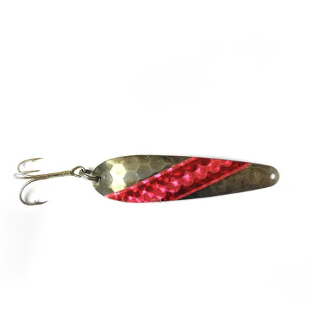 14 g (1/2 oz) masivní mosazi tvoří tělo této Northern King 28, trollingové plandavky zrozené z kanadského dědictví Len Thompsona v roce 1984. Výrazný červený holografický diagonální pruh protíná povrch v barvě oceli a doplňuje tepanou postříbřenou horní polovinu, která zachycuje světlo i za snížené viditelnosti. Tento exemplář (kód produktu 0113) o délce 9,5 cm (3 3/4") si zachovává čistý a jasný vzhled s hodnocením stavu 4/5. Použití pravého stříbření bylo technickou volbou výrobce, aby bylo zajištěno, že plandavka zůstane viditelná ve velkých hloubkách, kde se často pohybují jezerní pstruzi a lososi. Je vybavena standardním trojháčkem a robustním kroužkem.