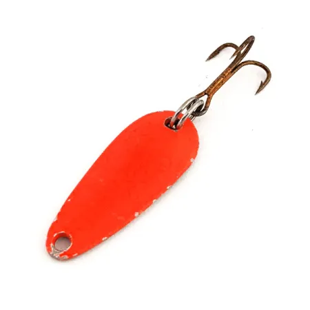 Tato vintage plandavka o délce přesně 3 cm (1 1/4") nabízí výrazný kapkovitý profil navržený pro ultralehkou přívlač. Nástraha má na přední straně vysoce viditelný oranžový povrch, který, jak napovídá název Otto's Ace UV, pod ultrafialovým světlem zářivě svítí. Plandavka o hmotnosti 3g (3/32oz) nese produktový kód 12763 a byla vyrobena v USA. Stříbrná zadní strana doplňuje jasně oranžový předek, zatímco výbava se skládá z jednoho kroužku a trojháčku. Nástraha s hodnocením stavu 5/5 vykazuje mírné opotřebení na hranách laku a tmavší odstín kovového povrchu háčku.