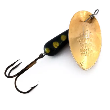 Klasické logo lva Panther Martin je vyraženo přímo do pozlaceného listu spolu s nápisem 'Italy' a číslem 15. Tato rotační třpytka o hmotnosti 1/2oz (15g) nese produktový kód 10134 a vyznačuje se charakteristickým provedením listu na ose (in-line), kde drát prochází přímo kovem. Zátěžové tělo má tvar kapky, je opatřeno černým lakem se třemi jasně žlutými tečkami pro kontrast. Při délce 2 3/4" (7cm) je nástraha zachována ve stavu 5/5 a má svůj původní bronzový trojháček. Zlatý list obsahuje také číselnou ražbu 1009460, což je charakteristický znak těchto starších italských exemplářů.