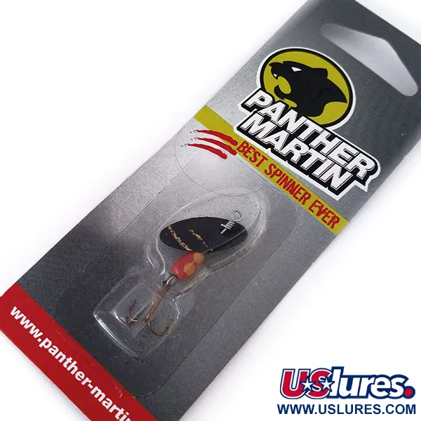 Tato v Itálii vyrobená rotační třpytka o hmotnosti 3/32 oz (2,5 g) je vybavena unikátní konstrukcí s průběžným listem (inline), jejímž průkopníkem byla značka Panther Martin. Tento konkrétní model Panther Martin 2 s produktovým kódem 10551 je proveden v barevném schématu BZ, které zahrnuje tmavě bronzový list zdobený černými a žlutými akcenty. Zatížené tělíčko ve tvaru kapky má zářivě červenou povrchovou úpravu s klasickými žlutými tečkami, což je vzor dlouhodobě oblíbený pro svou viditelnost v různých vodních podmínkách. Nástraha o celkové délce 1 3/4" (4,5 cm) je namontována na drátěné ose, která prochází přímo skrze konkávní list. Tato konstrukce eliminuje potřebu třmínku a umožňuje listu rotovat těsněji u tělíčka. Zadní strana originálního balení potvrzuje původ z italských výrobních závodů, což je detail často vyhledávaný sběrateli klasického vybavení. Třpytka je osazena bronzovaným trojháčkem bezpečně připevněným k základně zatíženého tělíčka. Nález tohoto exempláře v původním maloobchodním blistru je lahůdkou pro každého sběratele; nástraha je nepoužitá a zůstává ve stavu 6/5. Karta odráží dobový branding se sloganem „Best Spinner Ever“ a ikonickým logem pantera. Tovární nálepka na zadní straně označuje model jako PMRO GR. 2, což odpovídá specifikacím velikosti a hmotnosti této konkrétní série.