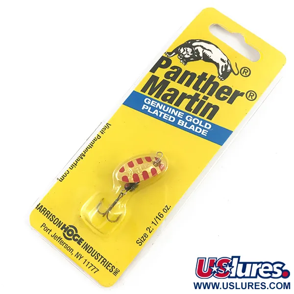 Červené diagonální pruhy na lopatce pozlacené pravým zlatem charakterizují tuto klasickou rotační třpytku o hmotnosti 1,77 g (1/16 oz). Tento model velikosti 2 s produktovým kódem 4540 využívá tradiční konvexní/konkávní design lopatky, která je nasazena přímo na ose nástrahy, což je typický znak řady Panther Martin. Délka 5 cm (2") je doplněna zatíženým tělem pro stabilitu při nahazování v malých potocích i na otevřené vodě. Tato nástraha, vyrobená v Dominikánské republice pro společnost Harrison-Hoge Industries, je v nepoužitém stavu, dokonale zachovaná v původním balení. Kapkovitý tvar těla a přímo montovaná lopatka jsou navrženy tak, aby se začaly otáčet ihned po dopadu na hladinu. Je vybavena standardními ostrými trojháčky, které jsou u těchto lehkých nástrah běžné, a je připravena na lov pstruhů nebo okounů.