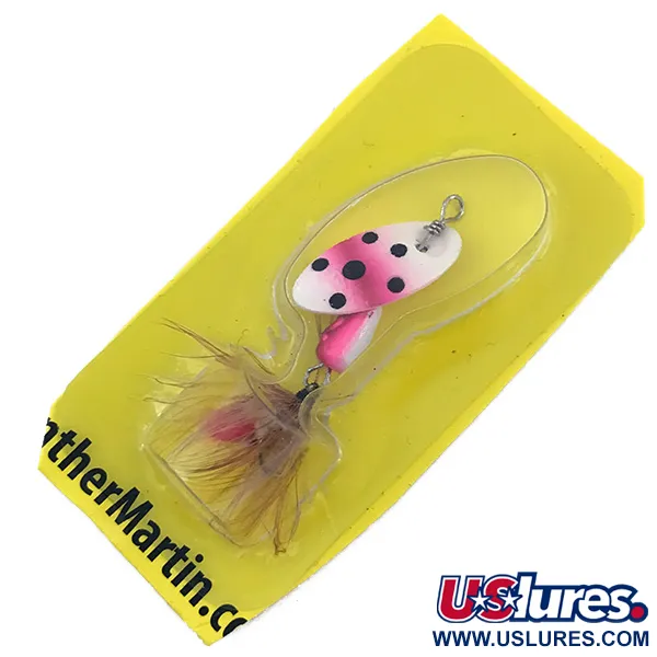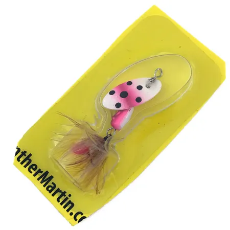 Tato rotační třpytka o hmotnosti 3/32oz (2,5g) se vyznačuje výrazným vzorem pstruha s bílým základem, zářivě růžovými okraji a černými tečkami. List je namontován přímo na ose, což je typický design Panther Martin, který vynechává tradiční třmínek pro dosažení vyšší rychlosti rotace. Nástraha měří 2" (5cm) a je vybavena trojháčkem s žlutým a hnědým peřím. Tento exemplář s kódem 4992 zůstává v původním žlutém blistru a je v nepoužitém stavu. Tělo ve tvaru kapky je vyváženo pro přesné nahazování, přičemž na obalu je uvedena země původu Dominikánská republika pro Harrison-Hoge Industries. Na zadní straně karty je historická adresa výrobce v Port Jefferson, NY, a standardní technická varování.