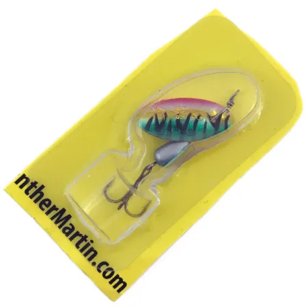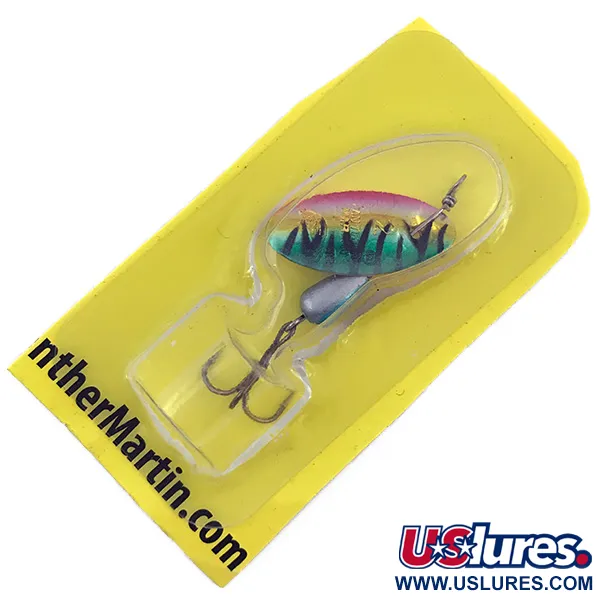 Zářivé růžové, žluté a zelené odstíny definují vzor Fire Tiger na listu této klasické rotační třpytky, doplněný tmavými svislými pruhy a reflexním povrchem. S hmotností 2,5 g (3/32 oz) a celkovou délkou 5 cm (2") se tato Panther Martin 2 vyznačuje pro značku typickým kapkovitým tělem a unikátním listem upevněným přímo na ose. Na rozdíl od mnoha jiných rotačních třpytek je list namontován přímo skrze hřídel, což je konstrukční prvek, který mu umožňuje volně rotovat a při stahování držet blíže u těla. Tento konkrétní model s produktovým kódem 4993 pochází od společnosti Harrison-Hoge Industries a je stále uložen v původním žlutém kartonovém obalu. Tělo má hladký metalický modro-stříbrný povrch zakončený ostrým trojháčkem. Třpytka je nepoužitá a zachovaná v originálním blistru, na jehož žluté zadní kartě jsou uvedeny kontaktní údaje na ústředí v Port Jeffersonu ve státě New York.