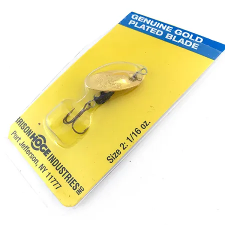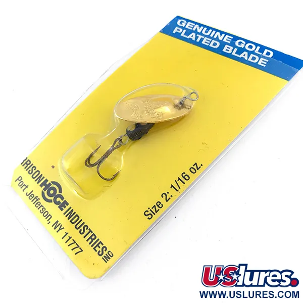 Skutečně pozlacená rotační lopatka definuje tuto rotační třpytku velikosti 2 a poskytuje výrazný odlesk určený pro situace s lehkým náčiním. Tento exemplář o hmotnosti 1/16 oz (1,77 g) a délce 2" (5 cm) nese kód produktu 4994 a pochází z éry výroby Harrison Hoge Industries. Lopatka je namontována přímo na středové ose, což je technický prvek navržený tak, aby umožňoval okamžitou rotaci při navíjení. Tato sestava je spojena se zatíženým černým tělem ve tvaru kapky a ostrým trojháčkem pro spolehlivý výkon. Nástraha je uložena v původním žlutomodrém balení z Port Jefferson, NY, je nepoužitá a zůstává ve vynikajícím stavu. Zadní strana karty podrobně popisuje konvexně-konkávní design lopatky a obsahuje nezbytná bezpečnostní varování týkající se extrémně ostrých háčků.