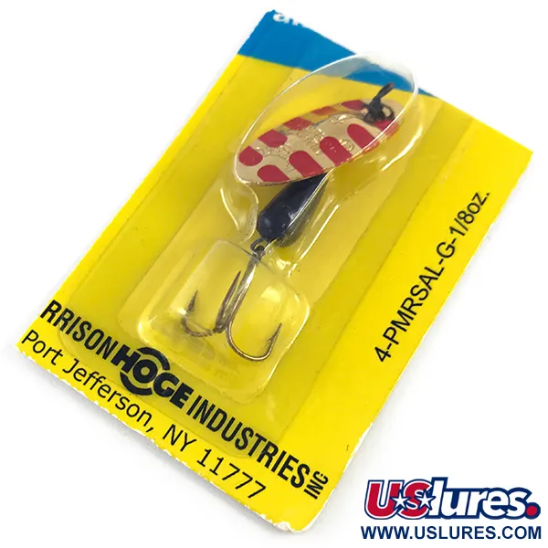 Tato klasická rotační třpytka o hmotnosti 4 g využívá zlatý list zdobený výraznými červenými tečkami. Nástraha je vyrobena s charakteristickou konstrukcí, kde list rotuje přímo na ose. Tento exemplář s produktovým kódem 4372 zůstává v původním blistru Harrison Hoge Industries s adresou Port Jefferson, NY. Protože je nepoužitý, tmavý povrch kapkovitého těla i trojháček jsou ve velmi zachovalém stavu. Kartonový obal má tradiční žluto-modrý design a na zadní straně obsahuje dobovou akční nabídku spolu s černobílou fotografií z rybolovu. Tento konkrétní model s označením 4-PMRSAL-G představuje 4,5 cm dlouhou konstrukci, díky které se Panther Martin stal základem pro lov pstruhů a okounů. Obal také odkazuje na webové stránky výrobce a adresu Columbia St., což dokumentuje specifickou éru v historii výroby této značky.