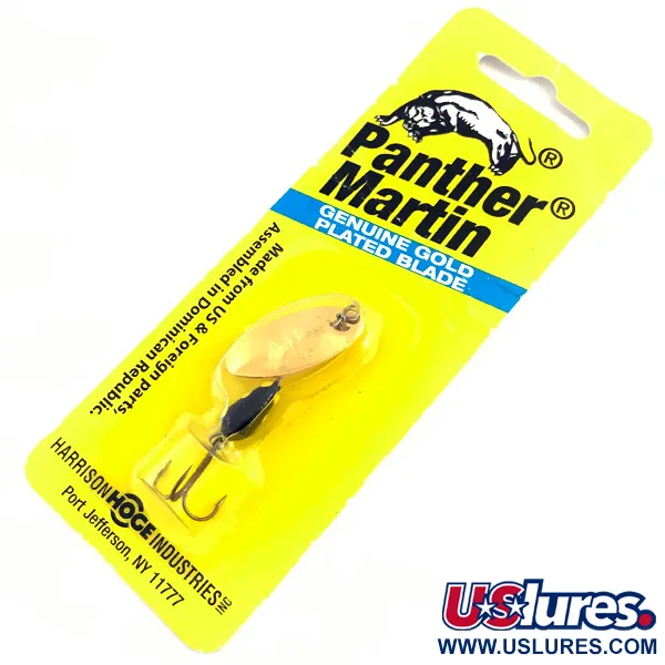 Pravé zlacení na konvexním listu řadí tuto rotačku o hmotnosti 4 g (1/8 oz) mezi klasickou volbu pro lov pstruhů v čisté vodě. Tento konkrétní exemplář s produktovým kódem 4583 se vyznačuje ikonickým designem listu namontovaného přímo na ose, což je poznávací znamení řady Panther Martin. Nástraha o délce 4,5 cm (1 3/4") využívá černé tělo ve tvaru kapky pro soustředění hmotnosti. List je upevněn přímo na drátěné ose, což je konstrukční detail uváděný na obalu Harrison-Hoge Industries pro vyvolání zvukových vibrací. Sestaveno v Dominikánské republice, žlutá karta nese označení modelu 4-PMR-G a adresu Port Jefferson, NY. Nástraha je nepoužitá v původním balení. Zadní strana uvádí technické parametry, jako je zatížené tělo a velmi ostré háčky.