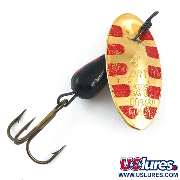 Zlatý list této vintage rotačky, opatřený ražbou „ITALY“ a sekvencí „1009450“, dává jasně nahlédnout do evropské výrobní historie této nástrahy. Tento model Panther Martin 4, katalogizovaný pod kódem 4666, se vyznačuje pozlaceným listem s červenými diagonálními pruhy v kombinaci s černým kapkovitým tělíčkem s oranžovo-červenými tečkami. S délkou 4 cm (1 1/2") a hmotností 4 g (1/8 oz) spoléhá konstrukce na slavný systém značky s přímým uchycením na ose, kde list rotuje přímo kolem drátu, což vytváří jedinečný profil rotace. Aktuálně je stav hodnocen 4/5, kovové povrchy si zachovávají vysoký lesk, zatímco lak na zatíženém tělíčku zůstává z velké části neporušený. Bronzový trojháček je originální a vykazuje typickou povrchovou úpravu bižuterie z poloviny století. Tělíčko ve tvaru kapky je navrženo tak, aby usnadňovalo stabilní vedení v různých rychlostech proudu. Číslice „4“ výrazně vyražená na ploše listu určuje tuto velikost jako univerzální pro středně lehký lov pstruhů a okounovitých ryb.