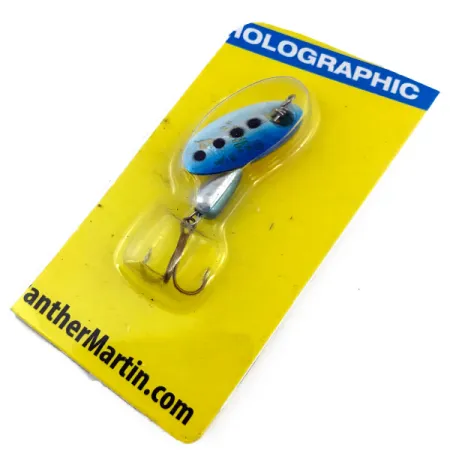Tato rotačka Panther Martin 4 o hmotnosti 1/8 oz (4 g) je ukázkovým příkladem řady Holographic v barevném provedení Blue Trout. Holografický list má čtyři výrazné tmavé skvrny na modrém gradientu, navrženém tak, aby odrážel světlo z jakéhokoli úhlu. Nástraha o délce 1 3/4" (4,5 cm) využívá charakteristickou konstrukci s listem upevněným přímo na ose, kde se list otáčí přímo na drátu namísto třmínku. Tento exemplář s produktovým kódem 5007 je v nepoužitém stavu v původním žlutém blistru. Stříbrné tělo ve tvaru kapky je zatížené pro snadnější nahazování v menších potocích. Na zadní straně obalu výrobní informace odkazují na společnost Harrison Hoge Industries z Port Jeffersonu v NY, přičemž zboží bylo vyrobeno v Dominikánské republice. Ostrý trojháček je upevněn za zatíženým tělem.