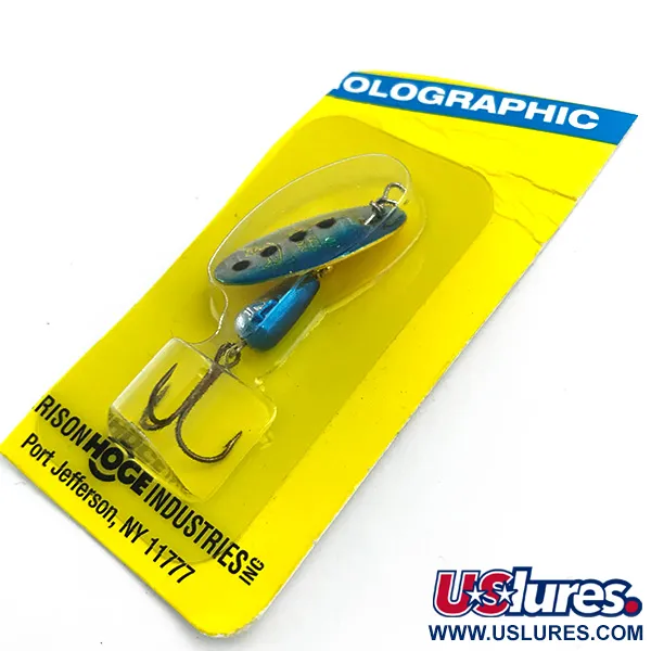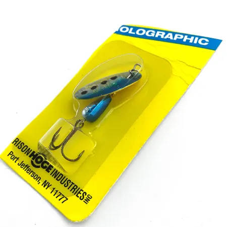 Třpytivé holografické šupiny zachycují světlo na klenutém hřbetu této klasické 1/8oz (4g) rotačky. Tento exemplář, vyrobený společností Rison Hoge Industries v Port Jeffersonu ve státě New York, ukazuje vývoj technologie povrchové úpravy značky s výrazným vzorem „Blue Trout“, který se vyznačuje sytě modrými odstíny a přesným černým tečkováním na kovovém podkladu. Nástraha o délce 4 cm (1 1/2") je postavena na zatíženém kapkovitém těle a unikátní konstrukci listu, který rotuje přímo na ose. Tato konstrukce, charakteristický znak výrobce, je určena pro hlubinnou prezentaci v tekoucích vodách. Nástraha zůstává upevněna na původním žlutém kartonu pod průhledným blistrem, což zachovává neporušenost stříbrného trojháčku a holografické fólie. Tato položka je nepoužitá. Stav: 6. Podle produktového kódu 5459 představuje klasickou éru výroby rybářských potřeb na Long Islandu, kdy byly holografické prvky poprvé integrovány do tradičních profilů nástrah.