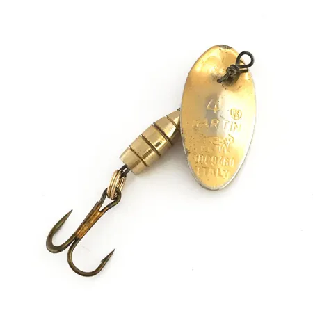 Na konvexním zlatém listu je jasně vyraženo označení velikosti '4' a značka italského původu, což potvrzuje, že se jedná o klasickou evropskou produkci. Tato rotačka Panther Martin 4 (kód produktu 9120) o délce 4 cm (1 1/2") a hmotnosti 4 g (1/8 oz) je postavena na charakteristické in-line konstrukci značky, kde je list namontován přímo na drátěnou osu bez třmínku. Mosazné tělo je unikátně segmentováno do zatíženého kapkovitého tvaru, což zajišťuje stabilitu při nahazování i vedení. Výbava je zakončena bronzovým trojháčkem zajištěným malým kroužkem u paty osy. Tento exemplář je ve stavu 5/5, vypadá výjimečně čistě s jasným a jednotným zlatým povrchem na všech kovových částech. Sběratelé často vyhledávají tyto verze 'Made in Italy' kvůli preciznímu opracování zátěžového těla a historickému odkazu rané výroby značky. Drátěná osa zůstává rovná a správně napnutá.