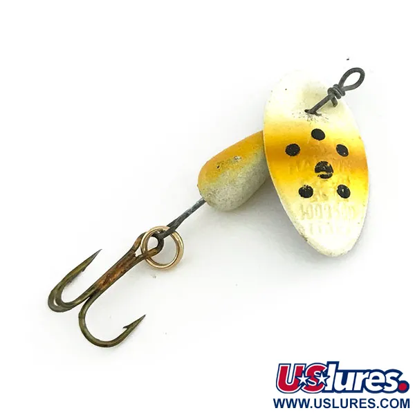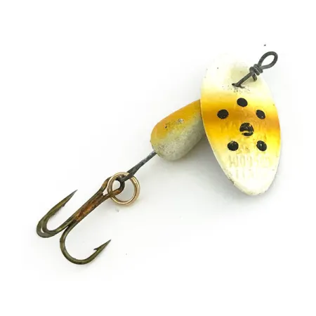 S ražbou „MADE IN ITALY“ na rotačním listu představuje tato třpytka klasické řemeslné zpracování značky Panther Martin. Tento exemplář o hmotnosti 4 g (1/8 oz), kód produktu 9264, se vyznačuje ikonickou konstrukcí s průběžnou osou, kde se list otáčí přímo na drátu bez třmínku. Měří 4 cm (1 1/2") a je vyveden ve vzoru „Brown Trout“, který tvoří žluto-krémový gradient s výraznými černými tečkami na listu i na zátěžovém tělíčku. Výbava zahrnuje originální drátěnou osu, zlatavý kroužek a bronzový trojhák. Stav je hodnocen 5/5, lak na olověném tělíčku ve tvaru kapky zůstává ostrý a dobře definovaný. Tento specifický model je určen pro lov na lehké šňůry, primárně pro nahazování do úzkých proudných míst.