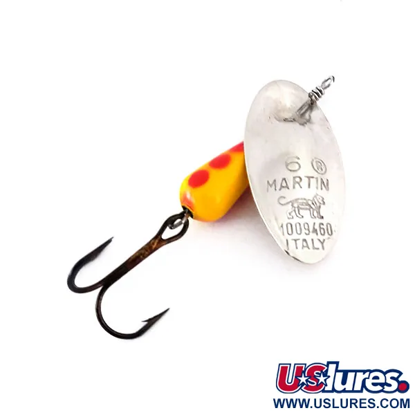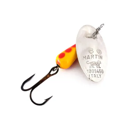 Na niklovém listu je jasně vyražena značka „ITALY“, což je charakteristický znak těchto raných evropských třpytek. Tato Panther Martin 6 má hmotnost 3/16 oz (6 g) a vyznačuje se ikonickou konstrukcí s listem přímo na ose, která ji odlišuje od tradičních rotaček s třmínkem. Samotný list je zdoben historickým logem lva a číslem patentu 1009460, což dokládá jeho historický původ. Třpytka o celkové délce 5,5 cm (2 1/4") je postavena na zářivě žlutém kapkovitém tělíčku s výraznými červenými tečkami. Niklový povrch listu zůstává lesklý, zatímco zadní část je osazena čistým trojháčkem s původním tmavým potahem. Hodnoceno stavem 5/5, drát je rovný a lak na tělíčku je mimořádně zachovalý. Protože je list namontován přímo na drátu, nabízí specifický rotační profil, díky kterému je tento model po desetiletí základem pro lov pstruhů. Tento kus, vedený pod kódem produktu 10141, ukazuje precizní řemeslné zpracování z italské éry výroby této značky.