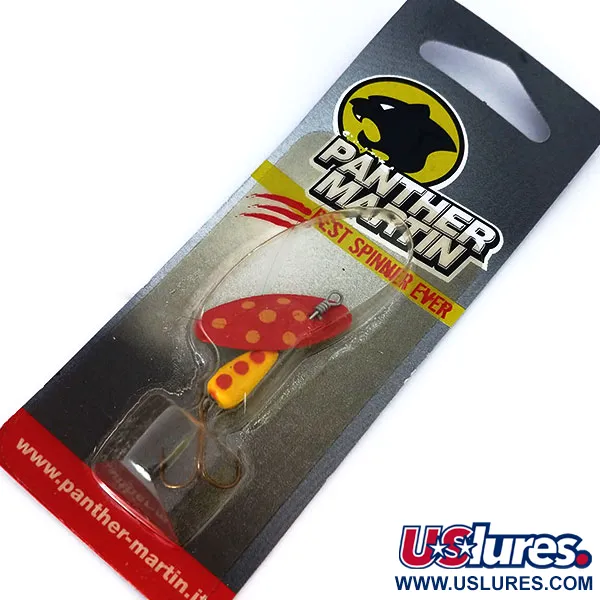 Tato v Itálii vyrobená rotační třpytka o hmotnosti 6g (3/16oz) se vyznačuje vysoce kontrastním červeno-žlutým (RY) barevným vzorem, který tvoří červený list se žlutými tečkami a žluté kapkovité tělo s červenými detaily. Tento model o délce 5cm (2") nese kód produktu 10323 a je osazen původním trojháčkem s bronzovou povrchovou úpravou. Konstrukce využívá pro Panther Martin typické upevnění listu přímo na ose, které umožňuje listu rotovat přímo na drátu bez použití třmínku. Nástraha je nepoužitá, uchovaná v původním blistru, který uvádí její původ a hmotnost 6 gramů. Kompaktní kapkovité tělo bylo navrženo pro vyvážené rozložení hmotnosti, což usnadňuje daleké hody proti větru nebo v rychle tekoucí vodě. Zadní strana obalu potvrzuje barevný kód a ikonické označení výrobce „Best Spinner Ever“ z éry jeho italské produkce.