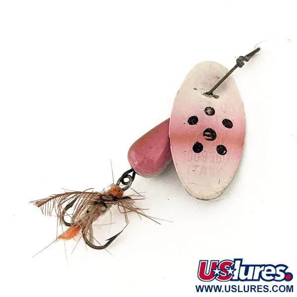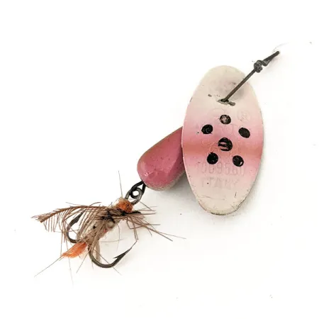 Pět výrazných černých teček vyniká na bílo-růžovém přechodu listu, což je typický vzhled pro tuto italskou klasiku. Tato třpytka Panther Martin 6 o hmotnosti 6 g (3/16 oz) měří 5 cm (2 in) a nese produktový kód 12601. Kapkovité tělo je nalakováno v odpovídajícím růžovém tónu a zakončeno trojháčkem s vázanými hnědými a oranžovými vlákny. Protože je list namontován přímo na ose, udržuje si velmi kompaktní profil ve srovnání s tradičními rotačkami s třmínkem. Tento konkrétní kus je ve stavu 5/5, přičemž ražba „ITALY“ na zadní straně listu zůstává ostrá a čitelná. Jemný růžový přechod v horní polovině listu vytváří pěkný kontrast k bílému základu. Drátěná konstrukce je pevná a veškerý hardware nevykazuje žádné známky opotřebení, čímž si zachovává svůj původní tovární lesk.