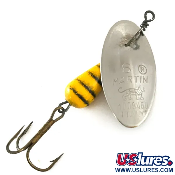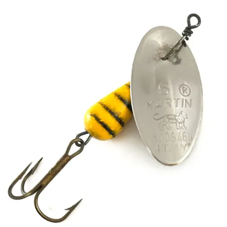 Jasně vyražená značka „6 MARTIN“ na niklové rotační čepeli spolu s klasickým logem lva potvrzuje její autentický italský původ. Tento konkrétní exemplář, katalogizovaný pod produktovým kódem 6329, má charakteristické kapkovité tělo v zářivě žluté barvě s výraznými černými vodorovnými pruhy. S hodnocením 5/5 zůstává nástraha ve výjimečném stavu a zachovává si původní tovární povrchovou úpravu na zatíženém těle i na leštěné niklové čepeli. Při hmotnosti 6 g (3/16 oz) a délce 5 cm (2") využívá konstrukce in-line rotačku, kde je čepel namontována přímo na drátěnou osu bez třmínku. Na zadní straně čepele je uvedeno číslo patentu 1039460 a hluboká rytina „ITALY“, která odkazuje na éru výroby těchto raných dovozů. Tmavý, ostrý trojháček na konci doplňuje tuto klasickou nástrahu určenou pro přesné nahazování v pstruhových potocích nebo pro lehkou přívlač ve sladkých vodách.