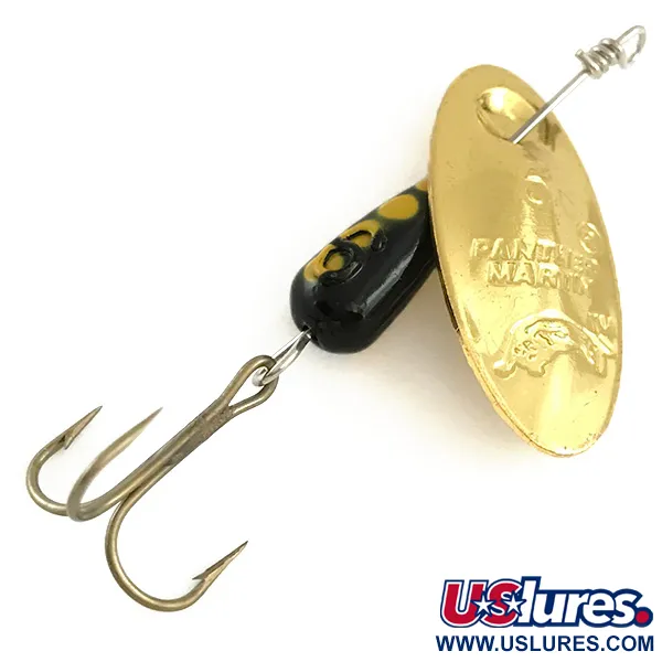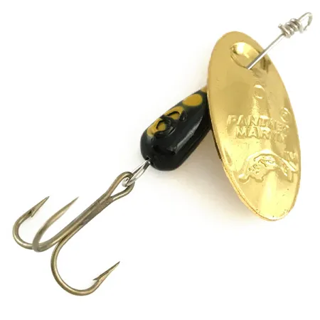 Přímo do konvexního zlatého listu je vyraženo ikonické logo ryby spolu s názvem „PANTHER MARTIN“ a velikostí „6“. Tento konkrétní exemplář, identifikovaný pod kódem 6511, se vyznačuje charakteristickým in-line provedením, kdy list rotuje přímo na ose bez třmínku. Nástraha o délce 5 cm (2") a hmotnosti 6 g (3/16 oz) je vyvážena černým kapkovitým tělíčkem se třemi zářivě žlutými tečkami. Tato rotační třpytka vyrobená v Itálii je osazena ostrým trojháčkem v bronzové povrchové úpravě. Jako nepoužitý sběratelský kus si nástraha zachovává svůj původní tovární lesk.
