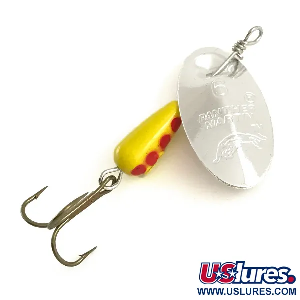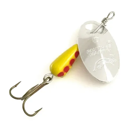 Do stříbrného listu je vyraženo číslo 6, které označuje velikost této klasické, v Itálii vyrobené rotační třpytky typu inline. Tento exemplář o hmotnosti 6 g (3/16 oz) a celkové délce 5 cm (2") se vyznačuje tradičním žlutým tělem ve tvaru kapky s výraznými červenými tečkami. Design modelu 6512 se vyznačuje tím, že list je namontován přímo na drátěné ose, což je charakteristický znak značky Panther Martin, který eliminuje potřebu třmínku. Tento systém přímé montáže zajišťuje, že se list při navíjení otáčí blízko těla. Samotný stříbrný list nese rozpoznatelné logo skákajícího pantera a název značky jasně vyražený do kovu. Tato konkrétní nástraha je nepoužitá a zůstává v původním továrním stavu, přičemž si zachovává lesk jak na lakovaném těle, tak na leštěném listu. Součástí výbavy je robustní trojháček připevněný pomocí kroužku k zatíženému tělu, vše postaveno na rovném drátěném rámu s horním očkem pro upevnění vlasce.