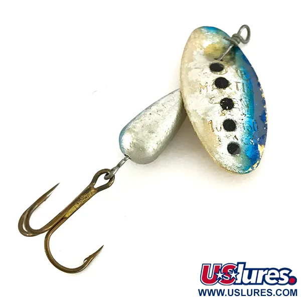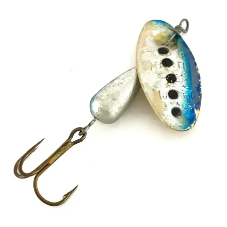 Klasické olověné tělo ve tvaru kapky pomáhá této vintage rotačce k efektivním náhozům při zachování stability. S váhou 3/16 oz (6 g) a celkovou délkou 2" (5 cm) patří tento exemplář k ikonické řadě známé svou unikátní konstrukcí, kde osa prochází přímo listem (in-line). Konvexní list má povrchovou úpravu v kombinaci stříbrné a modré s výraznými černými tečkami, což je barevné schéma, které vyniká nad běžnými zlatými nebo žlutými vzory. List s jasně vyraženou značkou výrobce rotuje kolem distančního korálku ve zlatém tónu, který zabraňuje zadrhávání o zátěžové tělo. Tato konkrétní Panther Martin 6 s produktovým kódem 7708 je vybavena trojháčkem s bronzovou povrchovou úpravou. Stav je hodnocen 4/5, vykazuje lehké opotřebení z předchozích výprav, ale zachovává si veškerý svůj původní konstrukční charakter.