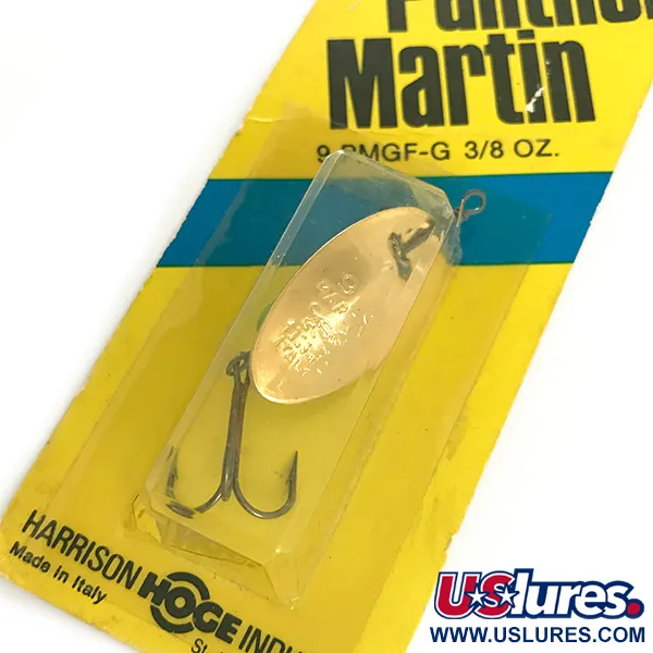 Srdcem této vintage rotační třpytky je zářivý pozlacený list, navržený tak, aby při každé rotaci odrážel světlo. S váhou 10,6 g (3/8 oz) je tento konkrétní kus těžší variantou v řadě, což umožňuje dosažení větší hloubky a delších náhozů. Nástraha s produktovým kódem 9 PMGF-G se vyznačuje charakteristickým listem upevněným přímo na ose, což je typický znak raných konstrukcí této značky. Tento kus byl vyroben v Itálii pro společnost Harrison-Hoge Industries ze Smithtownu v New Yorku, což připomíná éru evropské výroby a americké distribuce. Předmět zůstal nepoužitý v původním žluto-modrém blistru, který uchoval zlatý povrch i ostrý trojháček v původním stavu. Kompaktní kapkovité tělo je vyváženo pro stabilní chod při přitahování v různých proudech.