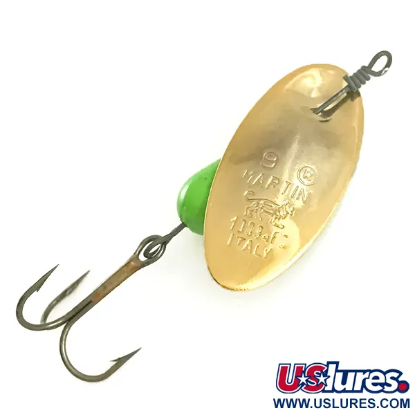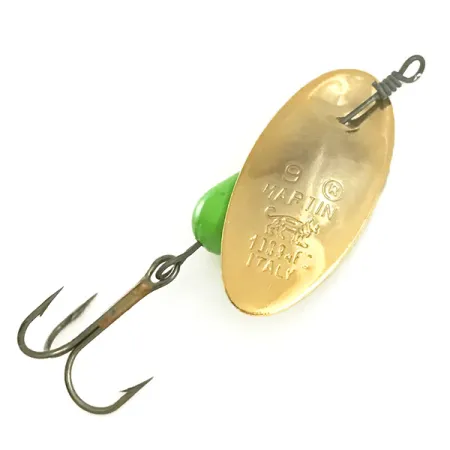 Do pozlaceného listu je jasně vyraženo číslo „9“ spolu se značkou „MARTIN“ a jejím charakteristickým logem tygra nad označením původu „ITALY“. Tento model o hmotnosti 9 g (1/3 oz) a délce 5,5 cm (2 1/4") představuje klasický inline design, který výrobce proslavil. Tělo ve tvaru kapky je pokryto sytým zeleným lakem, přičemž malý zlatý korálek odděluje tělo od bodu rotace listu. Tento exemplář, označený produktovým kódem 6596, je v nepoužitém stavu a vykazuje čisté linie a ostré ražby typické pro italskou výrobu. Součástí je robustní drátěná osa a ostrý trojháček.