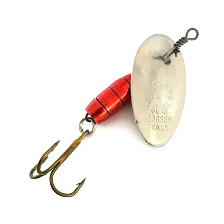 Na niklovaném listu je jasně vyražena velikost a italský původ, což z této nástrahy činí autentický kousek rybářské historie. Tento konkrétní exemplář, evidovaný pod kódem 8964, má ikonické tělo ve tvaru kapky v zářivě červené barvě s černými segmentovými pruhy. S hmotností 11g (2/5oz) a délkou 5,5cm (2 1/4") je skvěle vyvážen pro daleké hody do silnějších proudů. Konstrukce s listem přímo na ose je typickým znakem značky Panther Martin – drát prochází přímo niklovaným listem bez použití třmenu. Tato konstrukce pomáhá rotačce okamžitě pracovat po dopadu na hladinu. Jeden mosazný korálek zajišťuje odstup mezi červeným tělem a listem, zatímco na konci je pevný trojháček ve zlatém odstínu. Nástraha je v perfektním stavu 5/5, povrchová úprava zůstává jasná a ražba ostrá, což odráží dědictví kvality rané italské produkce.