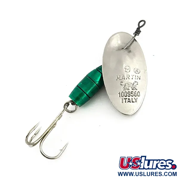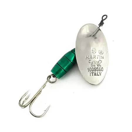 Označení „Italy“ zřetelně vyražené do niklovaného listu potvrzuje středomořský původ této vintage rotační třpytky Panther Martin 9 v provedení inline. S hmotností 11 g (2/5 oz) a délkou 5,5 cm (2 1/4") je účinně vyvážena pro nahazování do hlubších proudů. Členěné kapkovité tělo je dokončeno v zářivé metalické zelené barvě, která ostře kontrastuje s leštěným stříbrným tónem listu. Třpytka, katalogizovaná pod kódem 8988, využívá klasickou konstrukci s průběžnou osou, kde list rotuje přímo na drátu namísto na třmínku. Na lícní straně listu je hluboce vyražen název „MARTIN“, logo kočky a registrační číslo 1009560. Malý mosazný korálek zajišťuje hladký povrch pro rotaci listu při přitahování. Hardware si udržuje hodnocení stavu 5/5, zůstává lesklý a plně funkční.