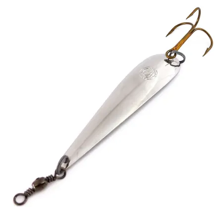 Leštěný nikl pokrývá celý 7 cm (2 3/4") povrch této specializované italské trolingové plandavky. Tento model, označený jako Alborella Verbano Tirlindada s produktovým kódem 10253, odráží evropské řemeslné zpracování značky Panther Martin a její historii výroby náčiní pro specifické regionální techniky. Robustní válečkový obratlík je předem namontován na předním kroužku pro zamezení kroucení vlasce, zatímco na konci je osazen trojháček v bronzové povrchové úpravě. Štíhlý profil nástrahy o hmotnosti 7 g (1/4 oz) napodobuje přirozenou siluetu malých nástražních rybek. Vyrobeno v Itálii, tento konkrétní kus je nepoužitý, i když již není v originálním obalu. Na horní konvexní straně kovového těla je vyražen kruhový punc značky, který potvrzuje její původ mezi klasickým evropským jezerním náčiním.
