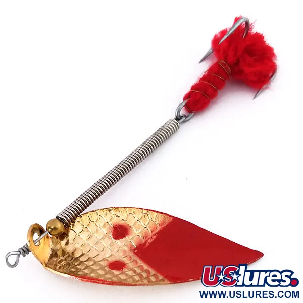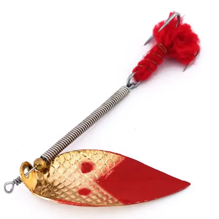 Texturovaný šupinatý vzor zdobí pozlacený list této v Itálii vyrobené rotační třpytky, doplněný pevným červeným hrotem a dvěma červenými tečkami. Panther Martin Francese Tirlindada con Lana s kódem produktu 10549 má speciální konstrukci těla, kde je drátěné jádro uzavřeno v těsně navinuté kovové pružině. Třpytka o hmotnosti 5g (3/16oz) a délce 7cm (2 3/4") je osazena trojháčkem s hustým červeným vlněným střapcem. Tato vlněná ozdoba je klasickým prvkem řady Tirlindada a dodává nástraze měkký profil. List ve tvaru vrbového listu je namontován přímo na ose, což je typický znak designu tohoto výrobce pro snadnou rotaci i při pomalém vedení. Tento konkrétní kus je nepoužitý, v původním čistém a lesklém stavu z výroby.