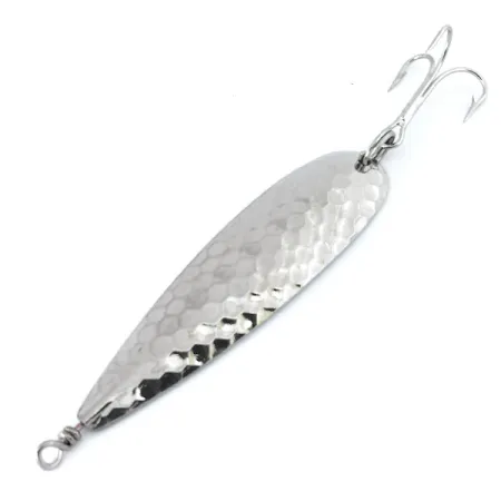 Osm gramů (1/4 oz) kovu italské výroby tvoří tuto nástrahu, která se vyznačuje výrazným důlkovaným povrchem „Martellato“. Tato plandavka, určená především pro trolling, odráží světlo díky svému poniklování s tepaným efektem, čímž napodobuje záblesky kořisti ve vodě. Prodloužený profil o délce 8 cm (3 1/4") je doplněn ostrým trojháčkem a továrně osazeným obratlíkem v přední části pro snadné navázání. Tato Panther Martin Svizzero Martellato s kódem produktu 12233 je nepoužitý kus s čistou, vysoce reflexní plochou. Osazení zůstává lesklé a bez známek opotřebení, což zachovává původní kvalitu zpracování z italské produkce. Světlo se odráží od každého jednotlivého úderu kladiva na poniklovaném těle.