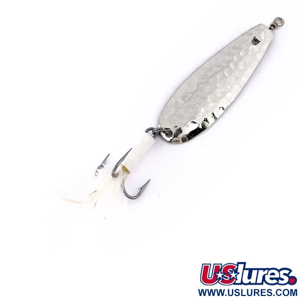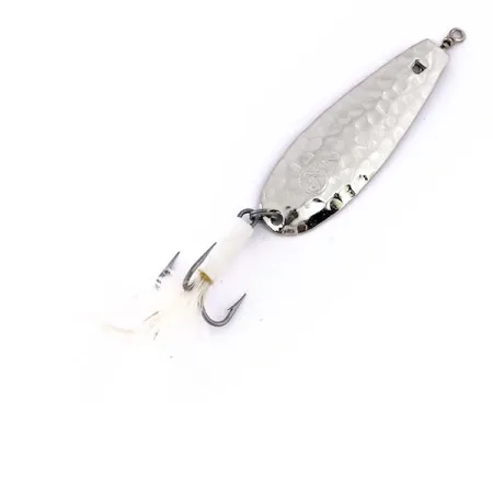 Povrch z tepaného niklu definuje reflexní vlastnosti této v Itálii vyrobené třpytky. Tento designový prvek má za cíl maximalizovat odlesky při nahazování i trollingu. Tato Panther Martin Svizzero Martellato con penna váží 5,5 g (3/16 oz), měří 5,5 cm (2 1/4") a je nepoužitá. Nástraha, vedená pod kódem produktu 10255, je osazena trojháčkem s bílým peřím, který jí dodává měkký a přirozený vizuální profil. Konstrukce z Itálie zahrnuje robustní horní obratlík pro minimalizaci kroucení vlasce. Každý důlek v kovu je přesně vyražen a bílé zdobení háčku zůstává čisté a skvěle zachovalé.