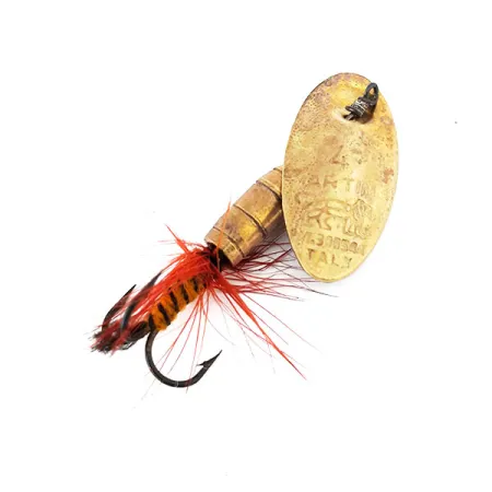 Přímo do mosazného listu této rotačky vyrobené v Itálii jsou vyražena originální čísla patentů a označení původu „Italy“, což odkazuje na její dědictví z továrny Panther Martin. Panther Martin Zavorra con Mosca 4 o hmotnosti 3/32 oz (3 g) se vyznačuje charakteristickým kapkovitým mosazným tělem, které zajišťuje vyváženou zátěž pro její 4cm konstrukci. Konstrukce „blade-on-shaft“ (list přímo na ose), která je typickým mechanickým prvkem této značky, eliminuje potřebu třmínku tím, že umožňuje mosaznému listu rotovat přímo kolem drátu. Tento exemplář s produktovým kódem 10936 je vybaven ručně vázanou muškou na trojháčku, která využívá zářivě červené sápky a oranžové tělo s černými pruhy, napodobující malou kořist. Pokud jde o zachovalost, nástraha je ve vynikajícím stavu 5/5, přičemž mosazné části vykazují čisté, ostré hrany a vázané prvky zůstávají zcela neporušené. Sběratelé evropského vybavení často vyhledávají tuto konkrétní italskou produkci kvůli preciznímu ovinutí drátu u očka. Těžké mosazné jádro umožňuje dosáhnout specifických hloubek v tekoucí vodě při zachování kompaktního profilu.
