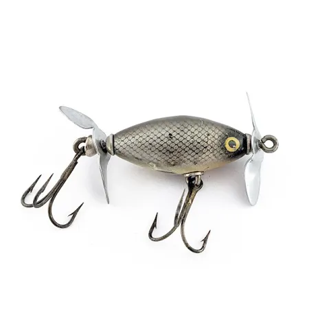 S kompaktní délkou 1 1/2 palce (4 cm) představuje tento Phillips Crippled Killer menší a vzácnější profil ve světě historických hladinových nástrah. Tělo zdobí klasický vzor stříbrných šupin, doplněný výraznou tmavou skvrnou na boku a jasně žlutýma očima, které zůstávají pozoruhodně čisté. Dvě vrtulky na přídi a zádi drží na místě robustní kovové kování spolu se dvěma trojháčky určenými pro přívlač na hladině. Tento exemplář z USA o hmotnosti 1/4 oz (7 g) se vyznačuje původní konstrukcí s očky se závitem, typickou pro výrobu z poloviny minulého století pro produktový kód 23434. Lakovaný povrch vykazuje pouze drobné známky používání v blízkosti oček pro háčky, což odráží dobře udržovaný stav 4/5.