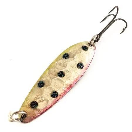 Tepaná voštinová textura vytváří na postříbřeném povrchu této plandavky Pirate Lures komplexní odlesky. Jedná se o kvalitní nástrahu vyrobenou v USA. S délkou 6,5 cm (2 1/2") a hmotností 12 g (2/5 oz) je model Pirate Joe's Silver Plated vyvážen pro všestranné použití ve vodě. Povrchová úprava se vyznačuje světle zelenožlutým odstínem na hřbetě a růžovo-červeným nádechem na břiše, což doplňuje sedm třpytivých černých teček tvořících kontrastní body na stříbrném podkladu. Zadní strana zdůrazňuje jasné postříbření a hloubku raženého šupinového vzoru. Nástraha je osazena originálními kroužky a ostrým trojháčkem, přičemž tento kus s kódem 12483 je ve stavu 5/5. Stříbrný povrch zůstává vysoce lesklý a dokládá řemeslné zpracování typické pro vintage designy Pirate Lures určené pro přívlač a trolling.