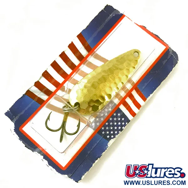 Textura tloukaného zlata na 4,5 cm (1 3/4") dlouhém těle dodává této plandavce Rainbow Plastics Pot-O-Gold charakteristický profil odrážející světlo. Tento exemplář s kódem produktu 4641 váží 7 g (1/4 oz) a představuje klasickou éru americké výroby rybářského náčiní pod značkou Double X Tackle. Nástraha je nepoužitá, umístěná na původním vlasteneckém červeno-bílo-modrém blistru s motivem hvězd a pruhů. Hardware se skládá z bronzového trojháčku spojeného s plandavkou robustním kroužkem, zatímco ražené kovové tělo má jeden čistý upevňovací otvor v užší hlavové části. Na zadní straně obalu je vyobrazeno logo Double X Tackle spolu s odkazy na jejich další významné produkty, včetně Ajust-A-Bubble a Torpedo Float.
