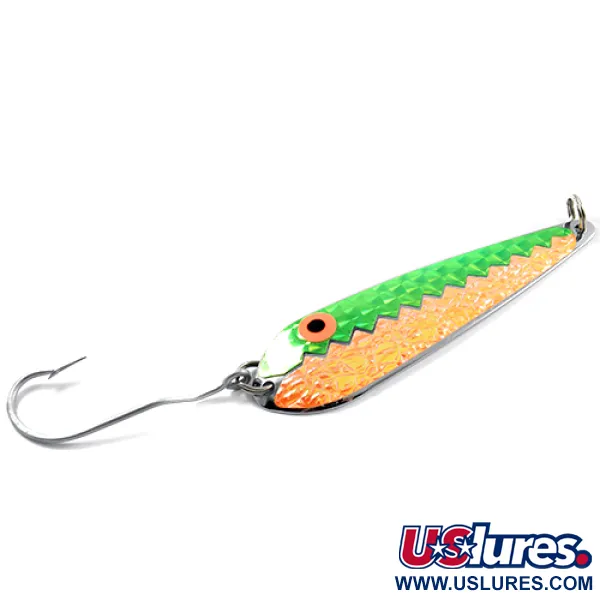 Fluorescenční zelená a strukturovaná oranžová se setkávají v ostrém cik-cak vzoru na lící této trollingové třpytky vyrobené v USA. Na leštěné stříbrné zadní straně je jasně vyražena značka Pro King, což odkazuje na její původ v rybolovu na Velkých jezerech. Tělo o hmotnosti 12,5 g (2/5 oz) je tvarováno pro efektivní vytlačování vody při trollingu. Nástraha o délce 9,5 cm (3 3/4") je vybavena velkým jednoháčkem a nerezovými kroužky. Pod produktovým kódem 1851 je povrchová úprava zachována ve stavu 5/5. Voštinová textura na oranžové polovině poskytuje vysoce kontrastní odlesky proti sytě zelené horní části, což je klasická barevná kombinace pro viditelnost v hluboké vodě.
