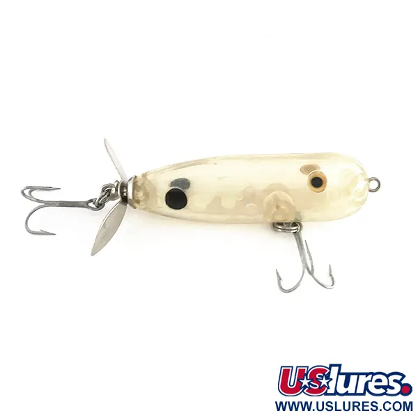 Na zadní části této klasické povrchové nástrahy typu walker je umístěna jedna stříbrná vrtulka, navržená tak, aby při plynulém přitahování čeřila hladinu. Tento model o hmotnosti 9,5 g (1/3 oz) a délce 6,5 cm (2 1/2") se vyznačuje plně průhledným plastovým tělem, které odhaluje vnitřní chrastící kuličky zodpovědné za jeho hlučný projev. Nástraha s produktovým kódem 7917 je unikátním dílem americké společnosti The Producers. Její vizuální atraktivitu podtrhují velké, vysoce kontrastní malované oči, které slouží jako jasný cíl pro dravce útočící na hladině, jako jsou okouni a štiky. Osazení tvoří dva trojháčky – jeden na břiše a druhý za vrtulkou – připevněné k zaoblenému tělu doutníkového tvaru. Tento zachovalý exemplář nevykazuje žádné známky používání a jeho stav je hodnocen 5/5.