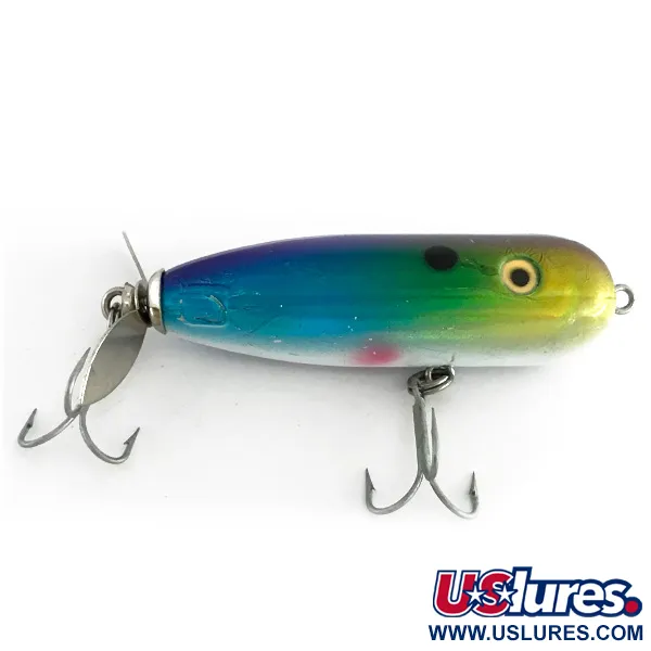 Zářivé duhové odstíny definují povrchovou úpravu této 6,5 cm (2 1/2") hladinové nástrahy, kde zlatožlutá na přídi přechází do sytě zelené, modré a tmavě fialové na hřbetě. Tento model značky Producers s kódem produktu 8297 je klasický americký topwater nástroj navržený k vytváření rozruchu na hladině. Na zádi je namontována nerezová vrtulka, která čeří vodu, zatímco vnitřní zvuková komora vydává při přitahování rytmický zvuk. Profil těla je hladký a protáhlý, osazený dvěma ostrými trojháčky upevněnými pomocí vrutových oček. Za hlavou se nachází výrazná černá tečka a na bílém břiše je viditelný malý růžový úderný bod. Malované žluté oči s tmavými zornicemi dodávají zúžené přídi tradiční vzhled. Nástraha je hodnocena stavem 5/5, je pozoruhodně čistá s jasnými barvami a lesklými kovovými prvky. S hmotností 9,5 g (1/3 oz) nabízí potřebnou váhu pro přesné nahazování při lovu příbřežních dravců.