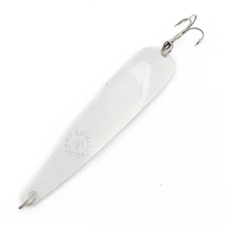 Na spodní polovině těla je jasně vyražen nápis 'QUICK STRIKE 31', který identifikuje tuto vintage americkou plandavku. S délkou 9,5 cm a hmotností 4,5 g se tato nástraha vyznačuje štíhlým, zužujícím se tělem s povrchovou úpravou ve vysoce leštěné stříbrné barvě. Tento konkrétní exemplář zůstává ve vynikajícím stavu, reflexní povrch je jasný a osazení je plně funkční, což odpovídá hodnocení stavu 5/5. Jeden trojháček je připevněn pomocí spojovacího kroužku v širší spodní části, zatímco v úzké horní části se nachází čistý otvor pro navázání vlasce. Tento vzácný kousek, katalogizovaný pod kódem 22320, vyniká svou jednoduchou, ale účinnou kovovou konstrukcí určenou pro přívlač nebo trolling.